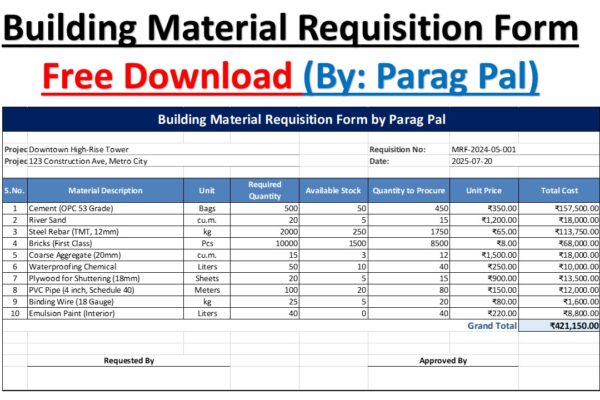 Introduction: In large-scale construction projects, even a single oversight in material planning can cause significant delays and cost overruns. That’s why smart requisition tools like the “Building Material Requisition Form” are crucial for every project manager. Parag Pal’s form, designed for the Downtown High-Rise Tower, showcases an efficient system for tracking inventory, forecasting procurement needs,…