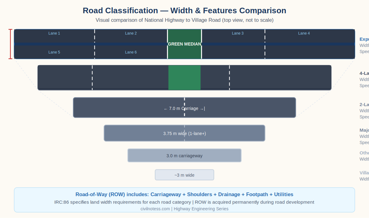 A well-structured road network requires systematic classification so that each category serves a specific purpose — from high-speed inter-city movement to last-mile village connectivity. In India, roads are classified based on function, administrative jurisdiction, and traffic characteristics as per the Indian Roads Congress (IRC) and MoRTH.